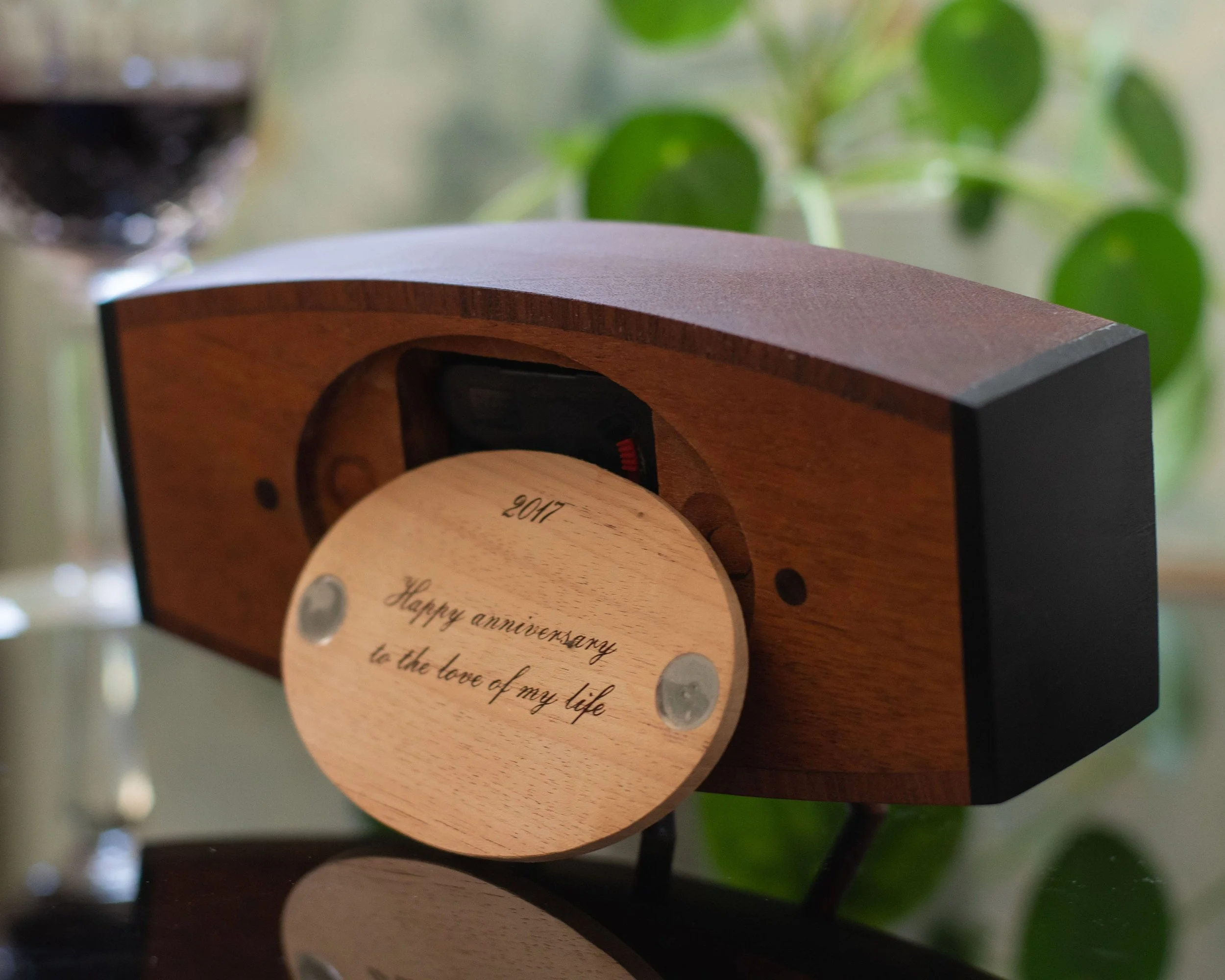 Each clock is handcrafted in Los Angeles from select mahogany, walnut, and maple, polished to accentuate the natural grain. Its durable, U.S.-made quartz movement ensures precision and longevity, while its proportions (8" wide × 5" tall × 2.25" deep) give it a grounded yet elegant presence on a desk or shelf.